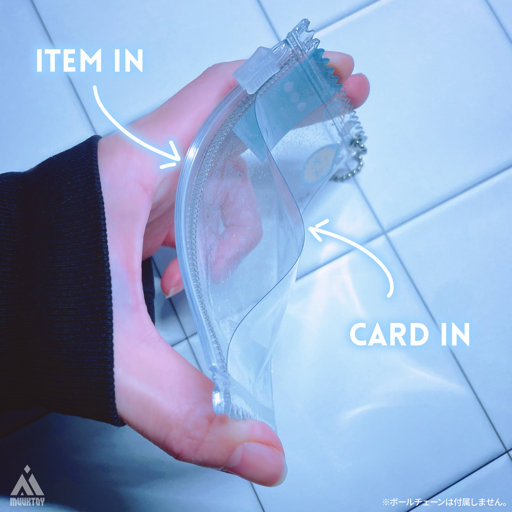 表面はジッパー付小物入れ、裏面はカードケースになっていて、ちょっとした小物や缶バッジも入れられるよ!推しのカードやチェキなどお気に入りのものを入れてみてね!